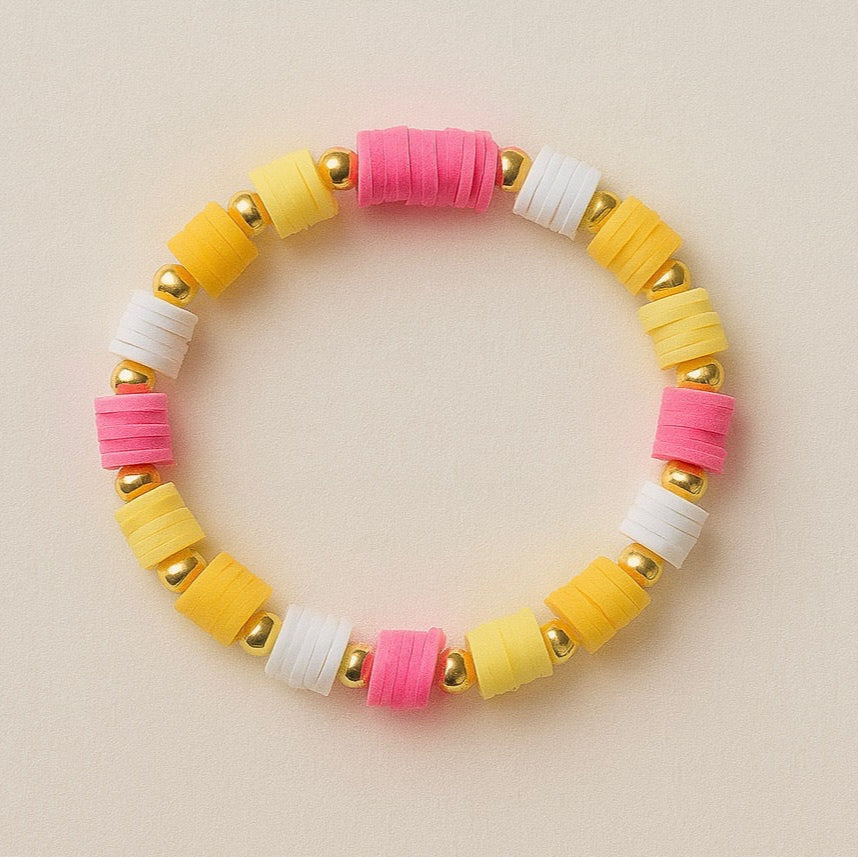 Materials: A neon clay bead bracelet, with gold circle shaped spacers